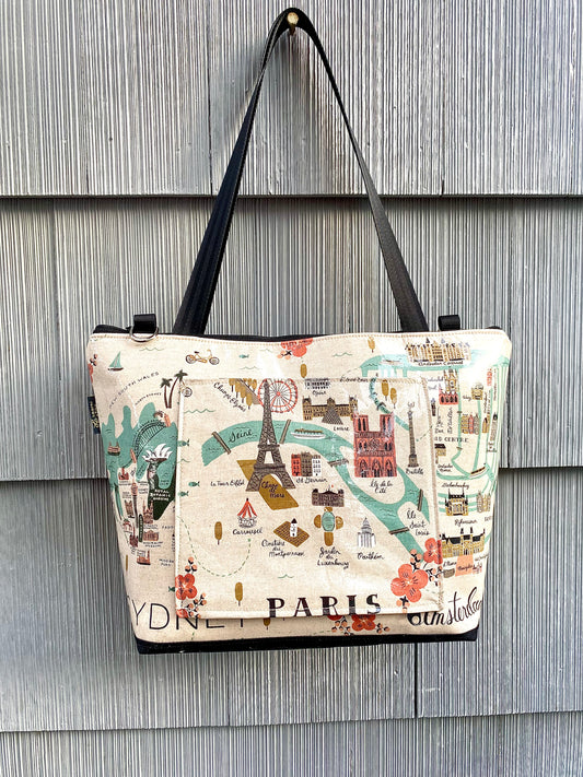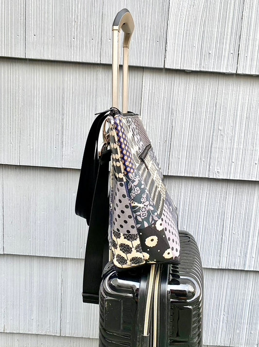 Lydia Tote w/trolley sleeve in Gray Bird Patchwork