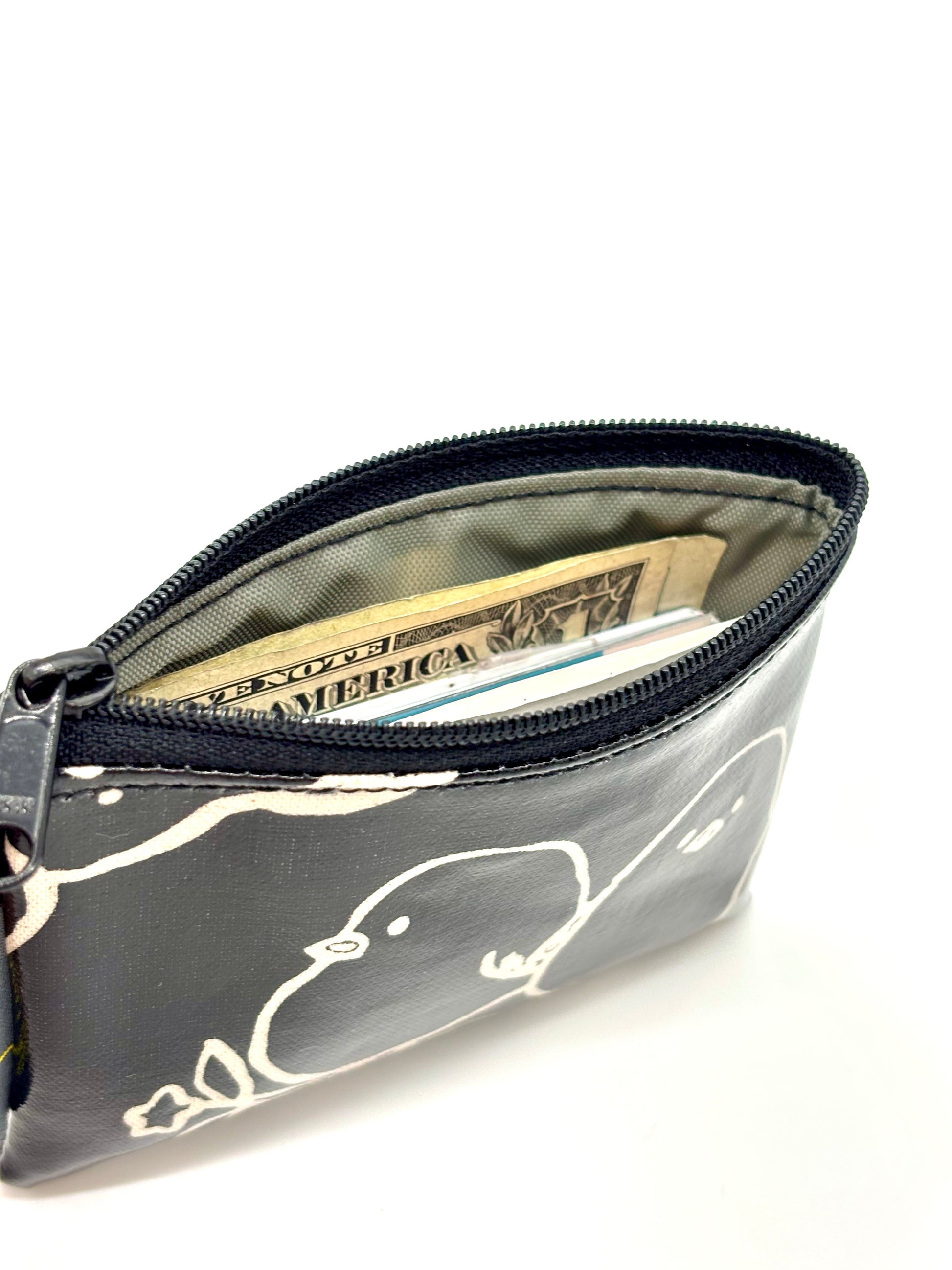 Coin purse or a small wallet for your cards and/or cash. Made of laminated cotton fabric that makes this little thing last for years. Pattern placement will vary. Measures 4 1/4 by 3 inches.
