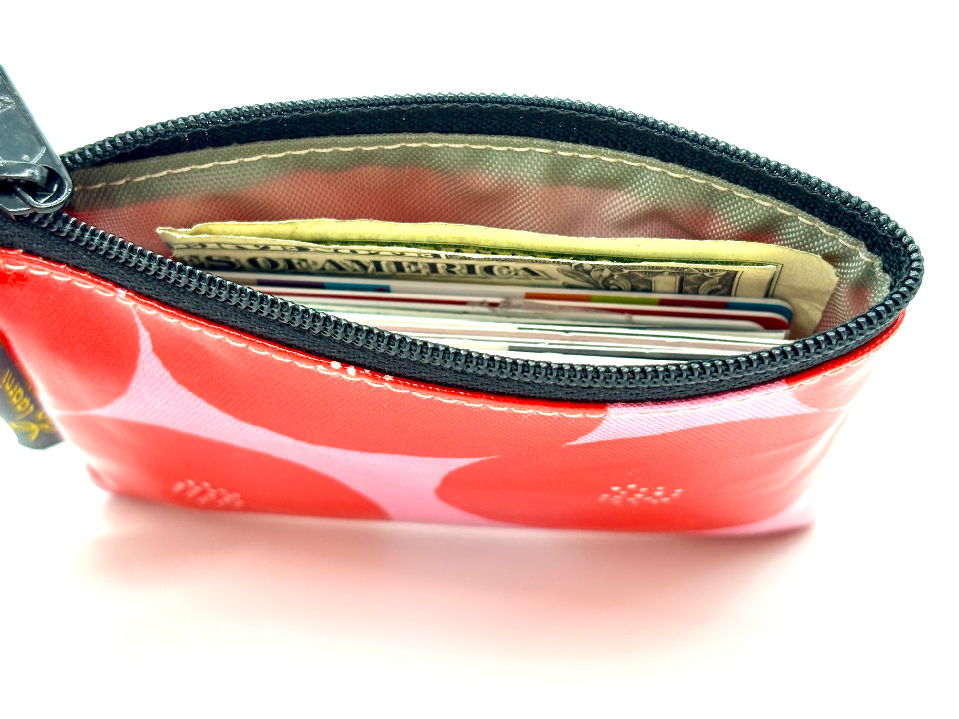 Coin purse or a small wallet for your cards and/or cash. Made of laminated cotton fabric that makes this little thing last for years. Pattern placement will vary. Measures 4 1/4 by 3 inches.