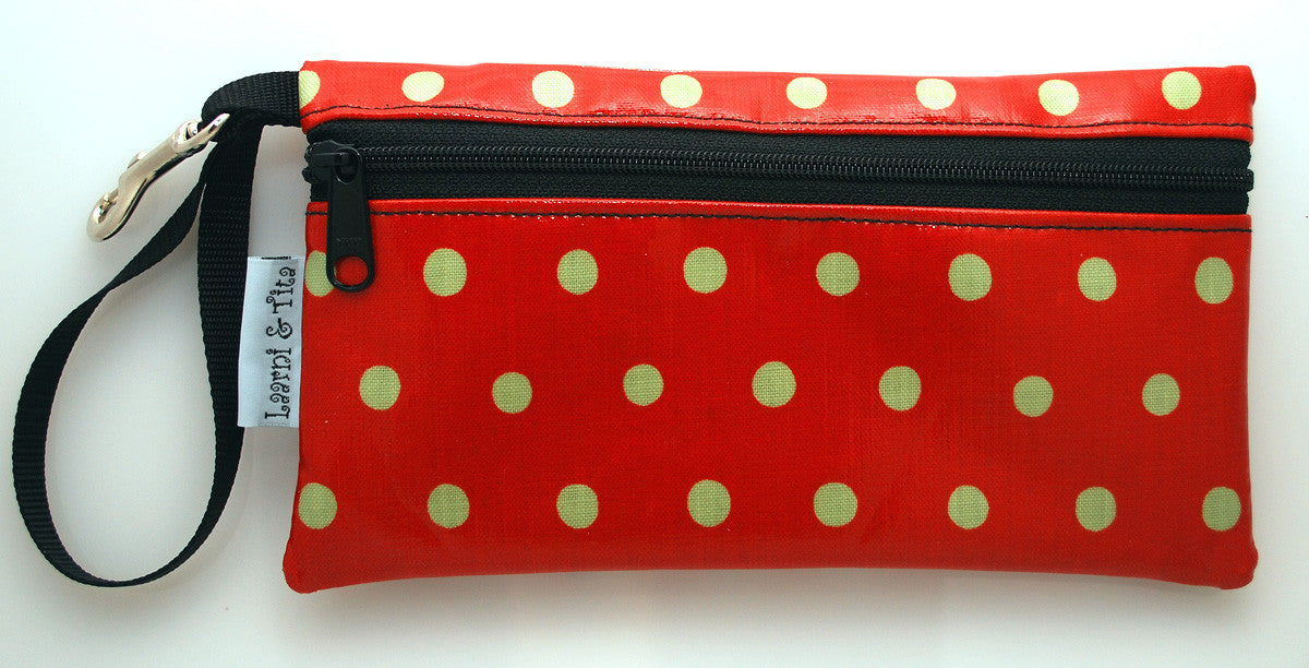 There's a divider and 2 card slots inside, a clip to attach keys or to a belt loop, black nylon strap for your wrist. Large enough to fit your checkbook, cell phone, passport, cash, etc... Placement of prints will vary slightly.