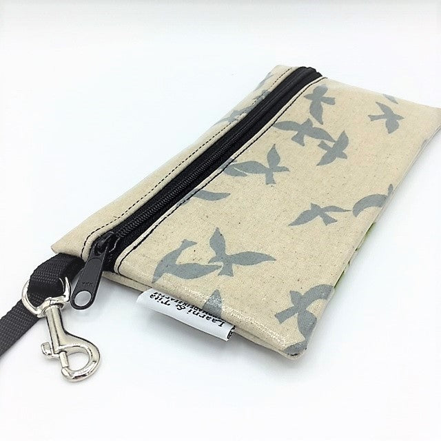 There's a divider and 2 card slots inside, a clip for keys or attach to a belt loop, black nylon strap for your wrist. Large enough to fit your checkbook, cell phone, passport, cash, etc... Placement of prints will vary slightly.