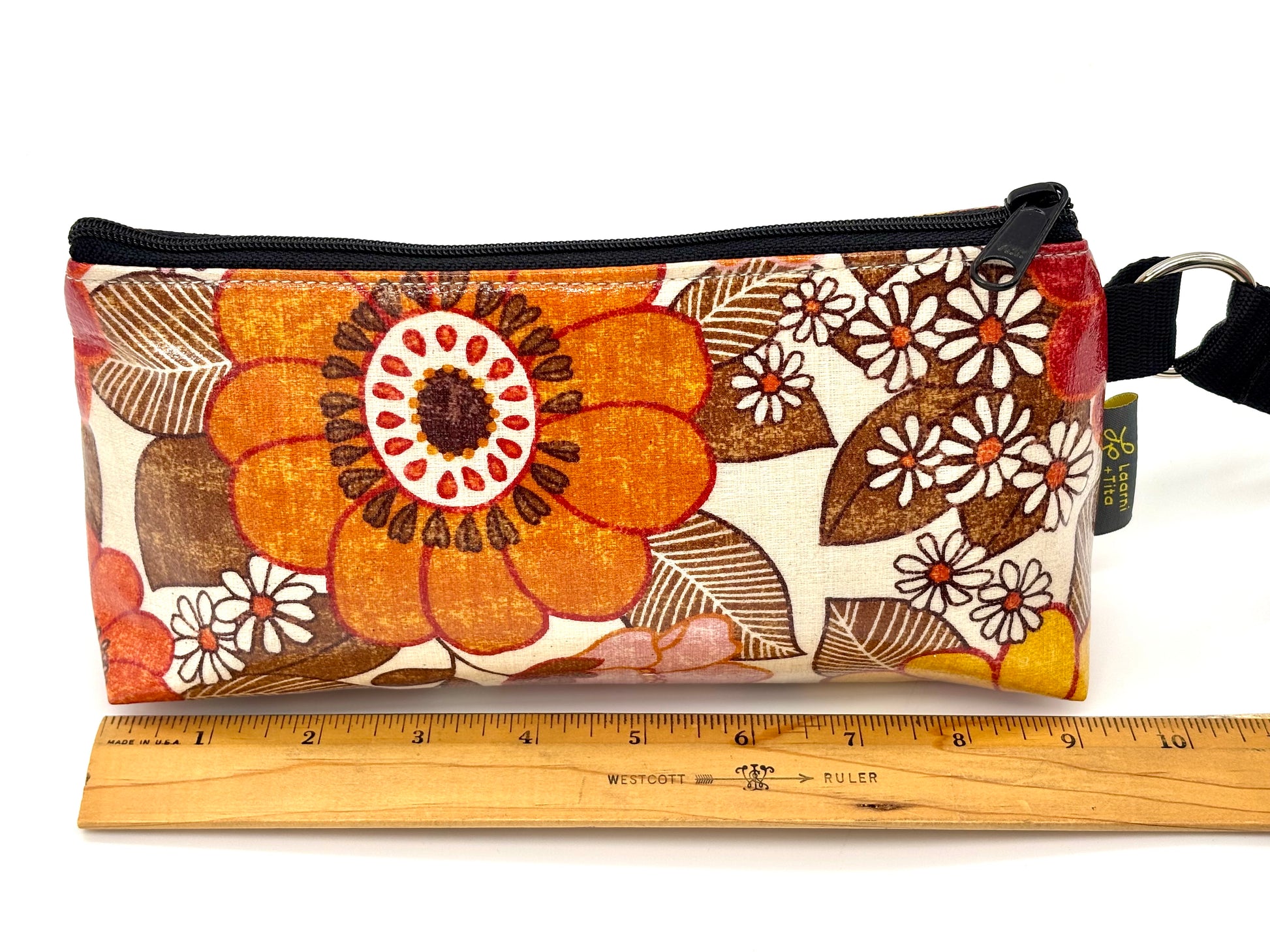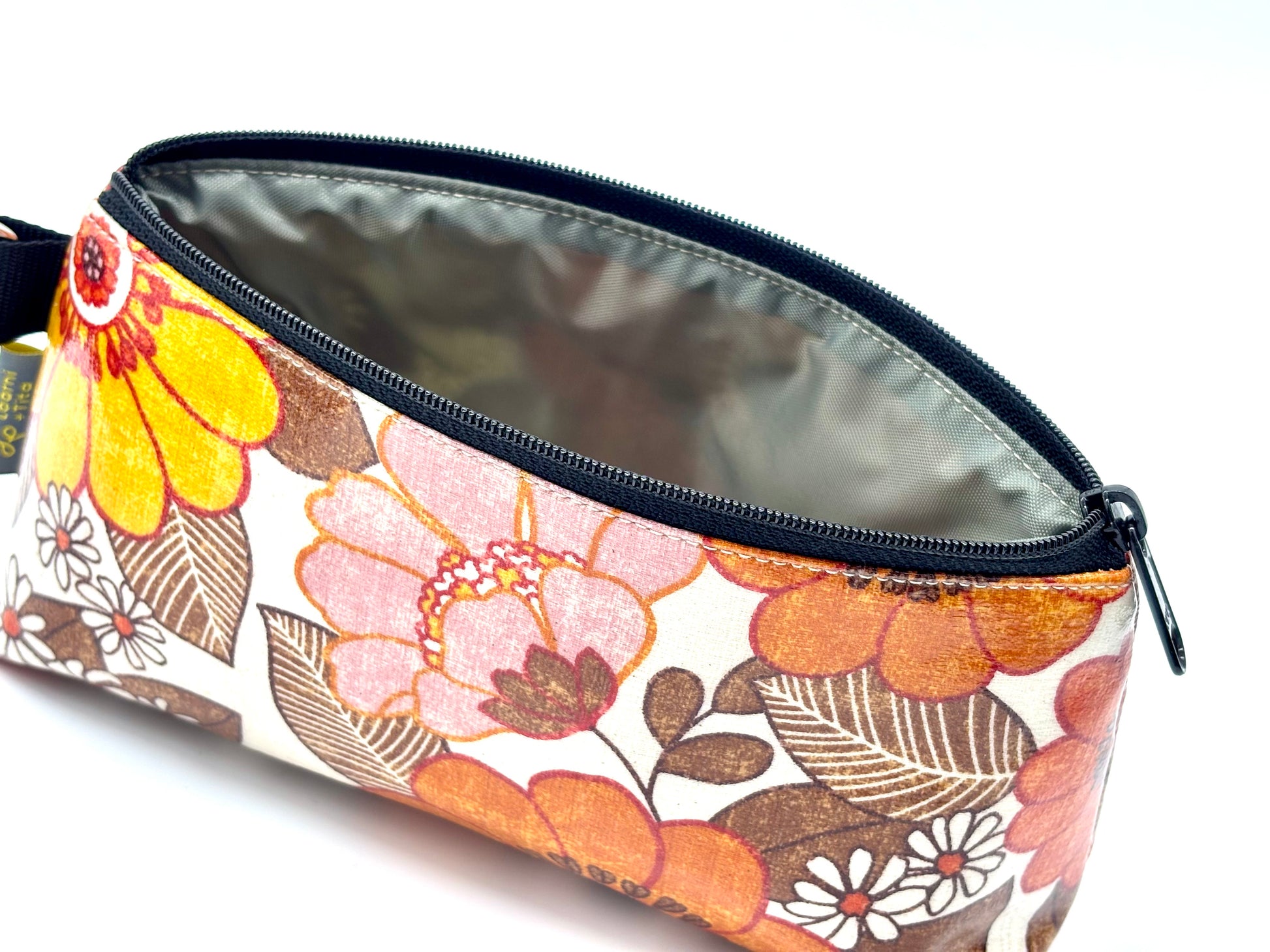 A pouch for your makeup or can be used as a wristlet purse for on the go. Each bag is cut and sewn individually. Pattern placement will vary. Made of laminated cotton fabrics, inside is lined with nylon. Wipe with damp cloth to clean or handwash then hang to dry.