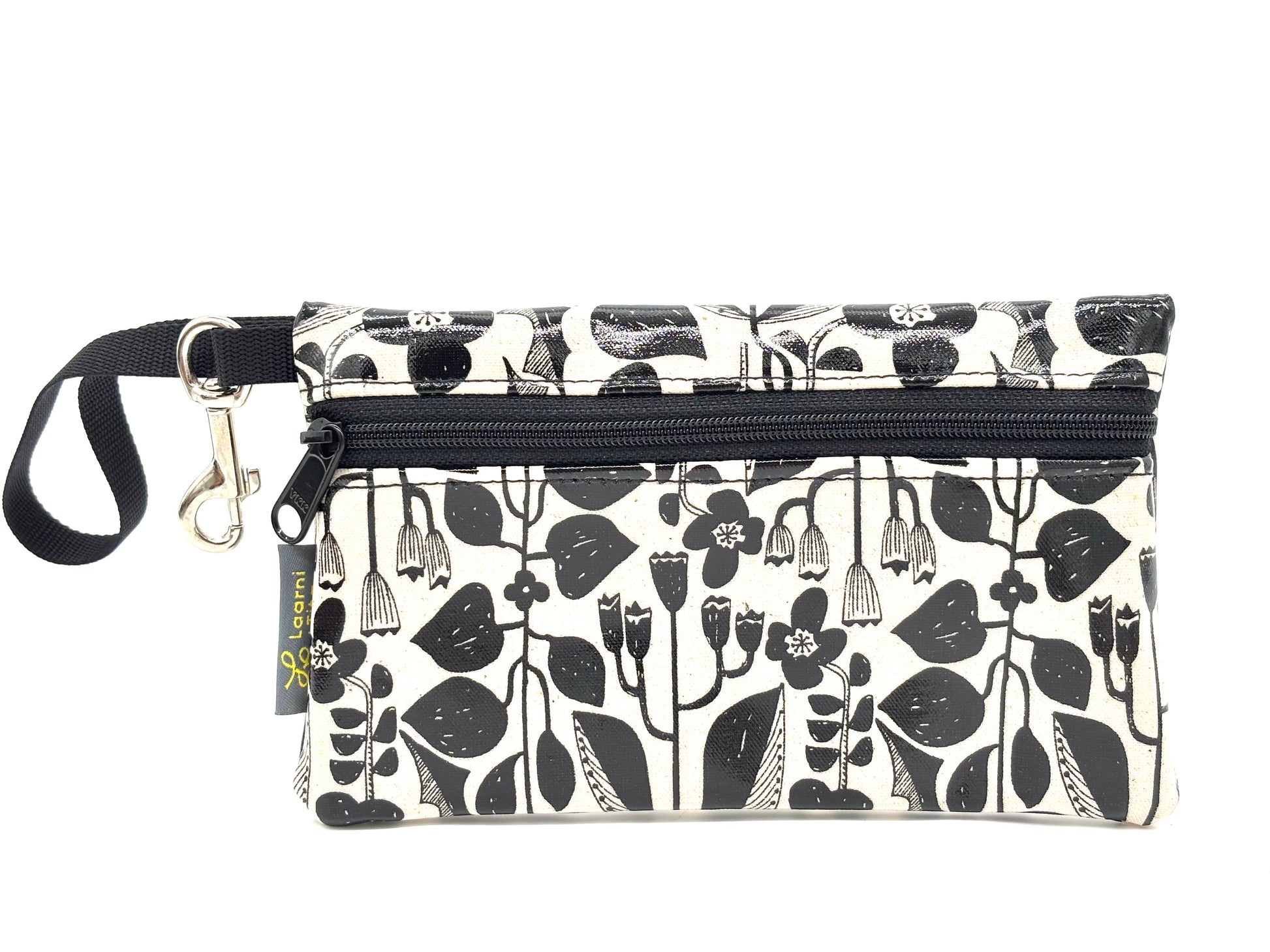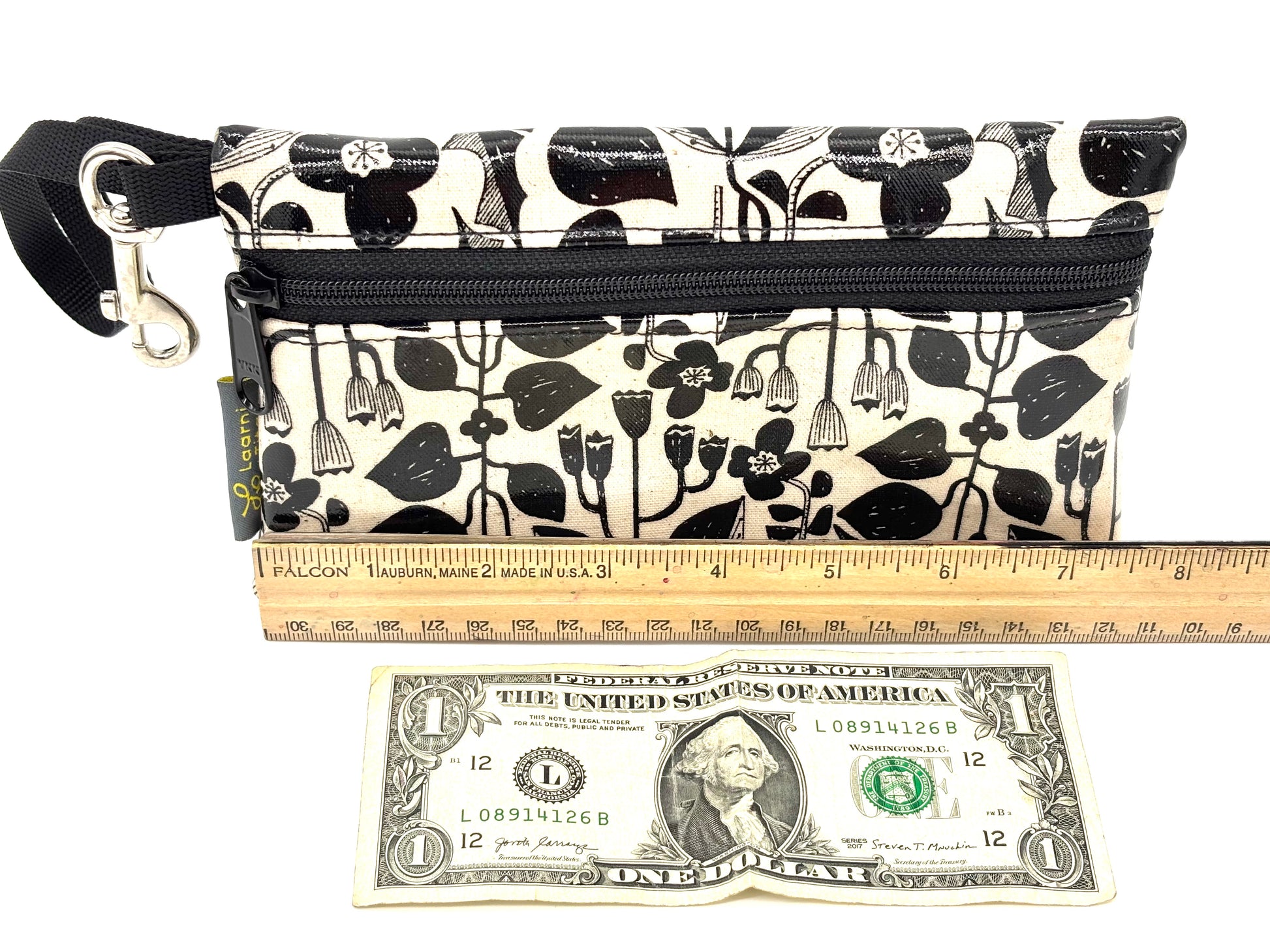 Great for when you just want to take your ID, some cash, your cell phone, lip gloss, and keys. There's a divider inside to keep things separated. Use the key clip for keys or clip to a belt loop. Black nylon strap for your wrist.