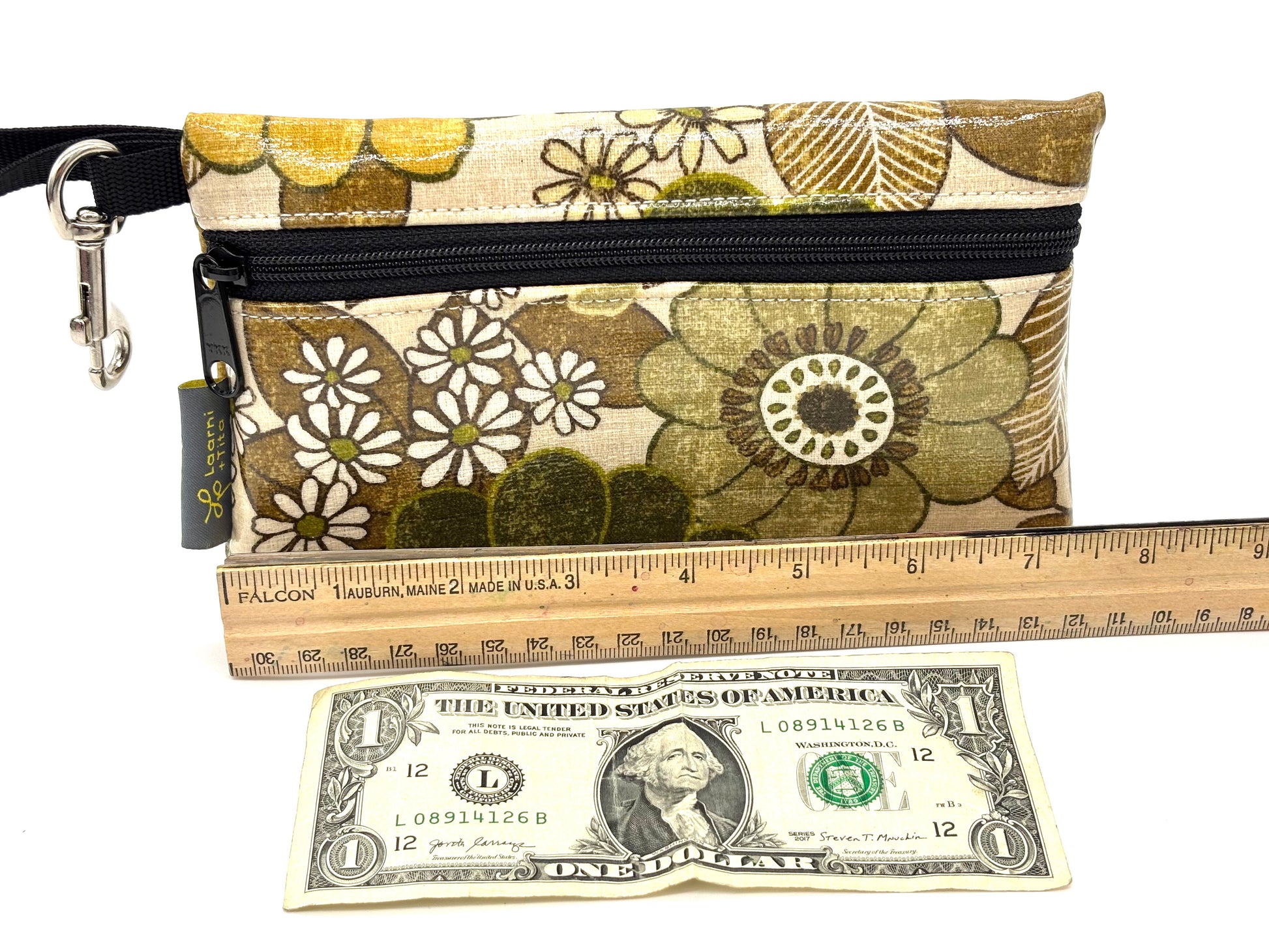 Outside fabric is laminated cotton canvas, nylon lining inside. Wipe with damp cloth to clean. It measures 7 1/2 X 4 1/2. The strap extends to 5 1/2 inches.