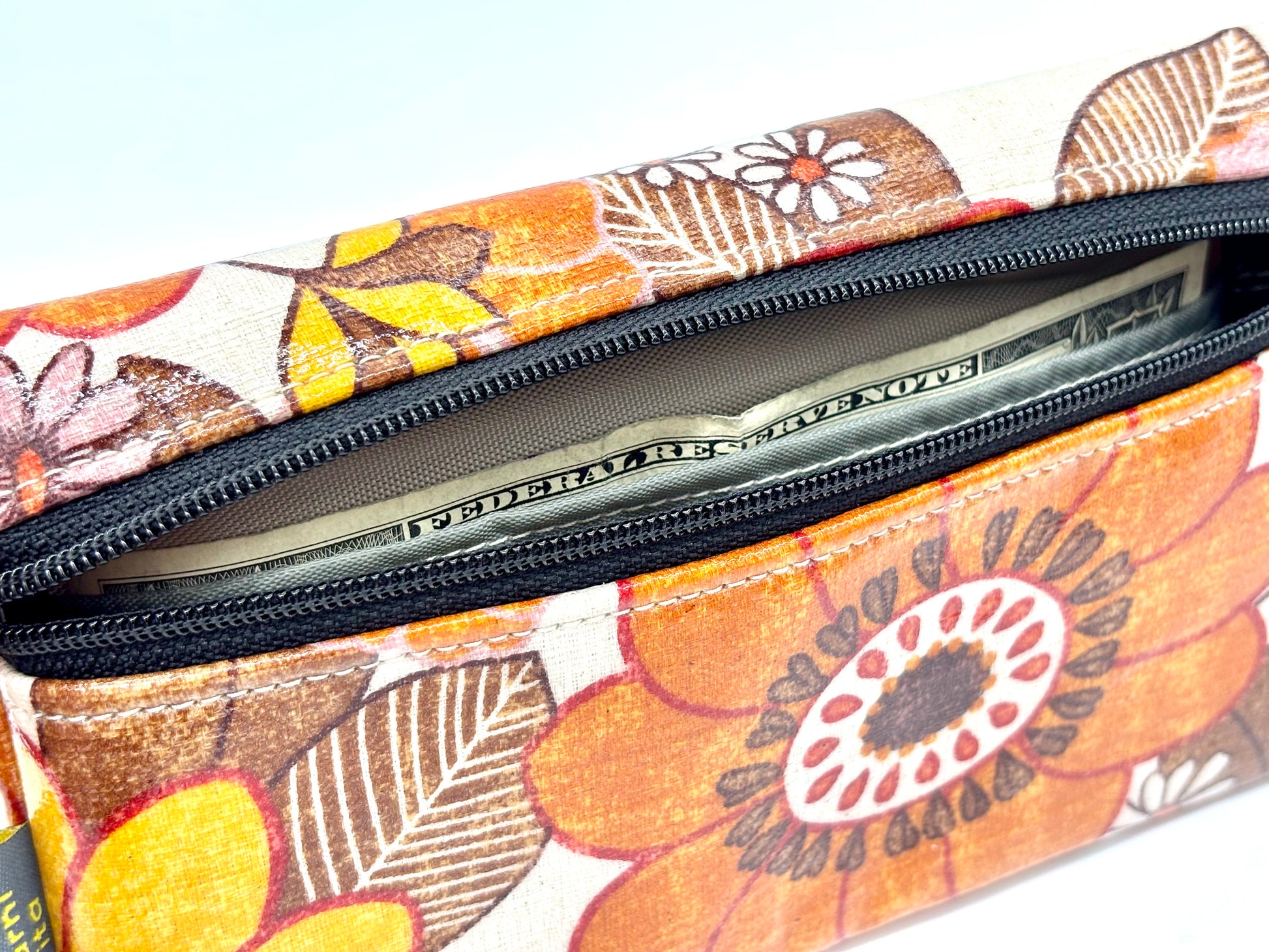 Outside fabric is laminated cotton canvas, nylon lining inside. Wipe with damp cloth to clean. It measures 7 1/2 X 4 1/2. The strap extends to 5 1/2 inches.