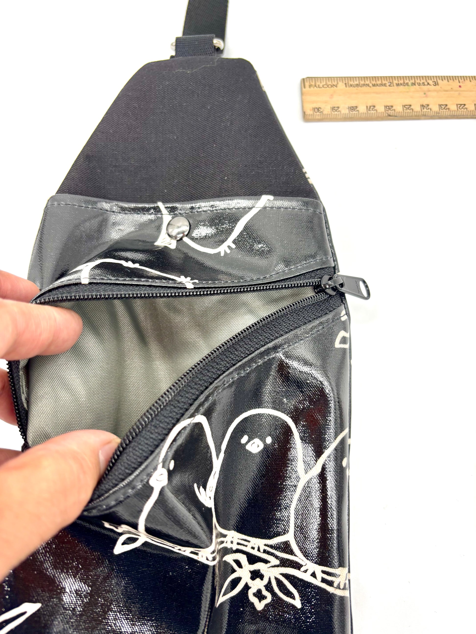 Travel Sling in Black Puffy Birds