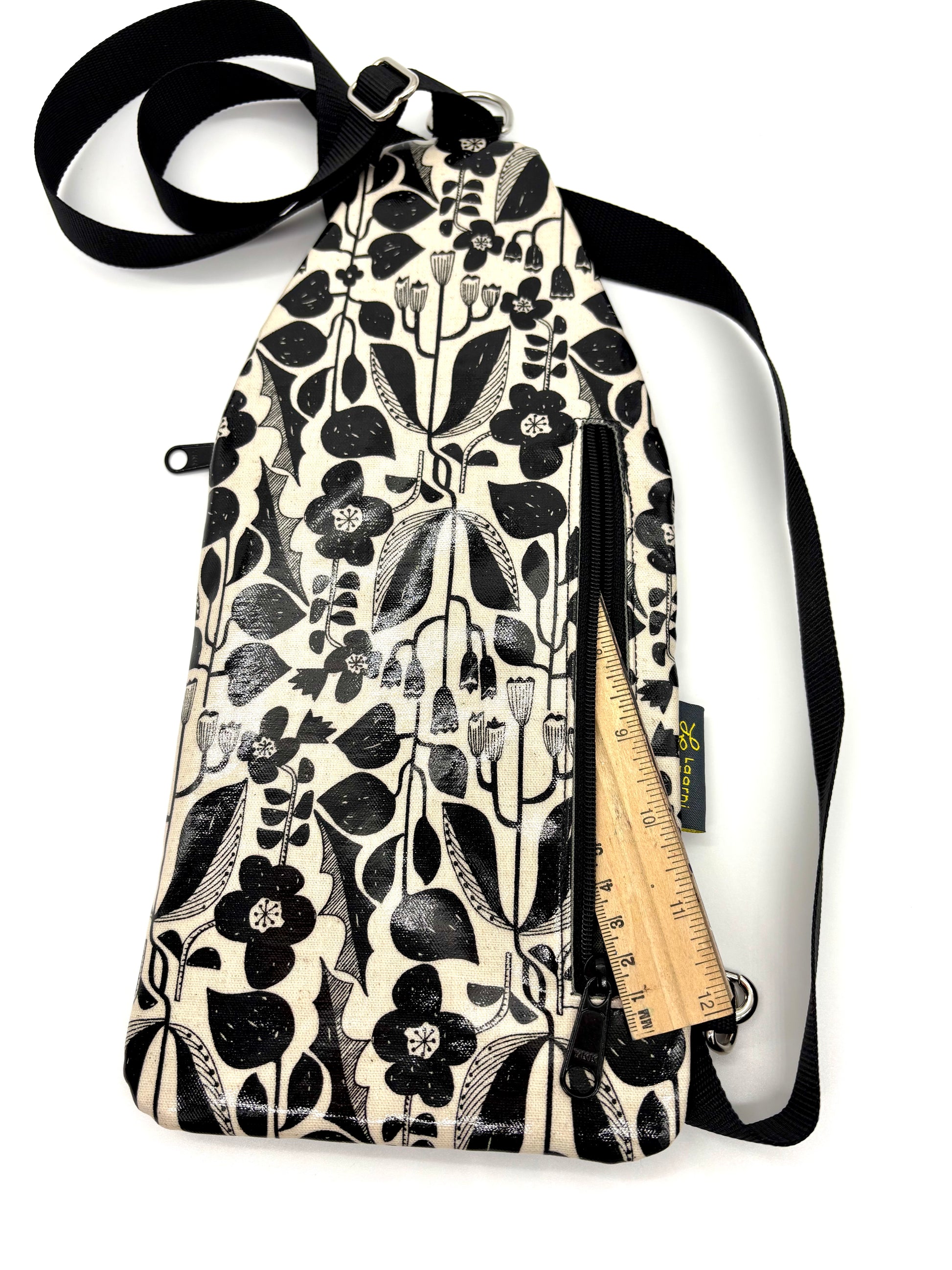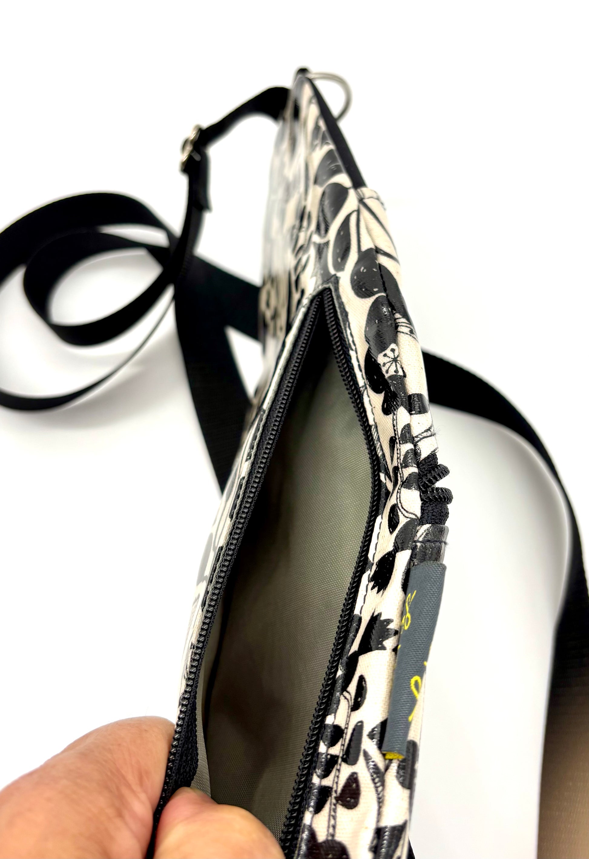 Outer fabric is laminated cotton canvas. Solid nylon accent fabric in black. Inside lining is nylon in silver.