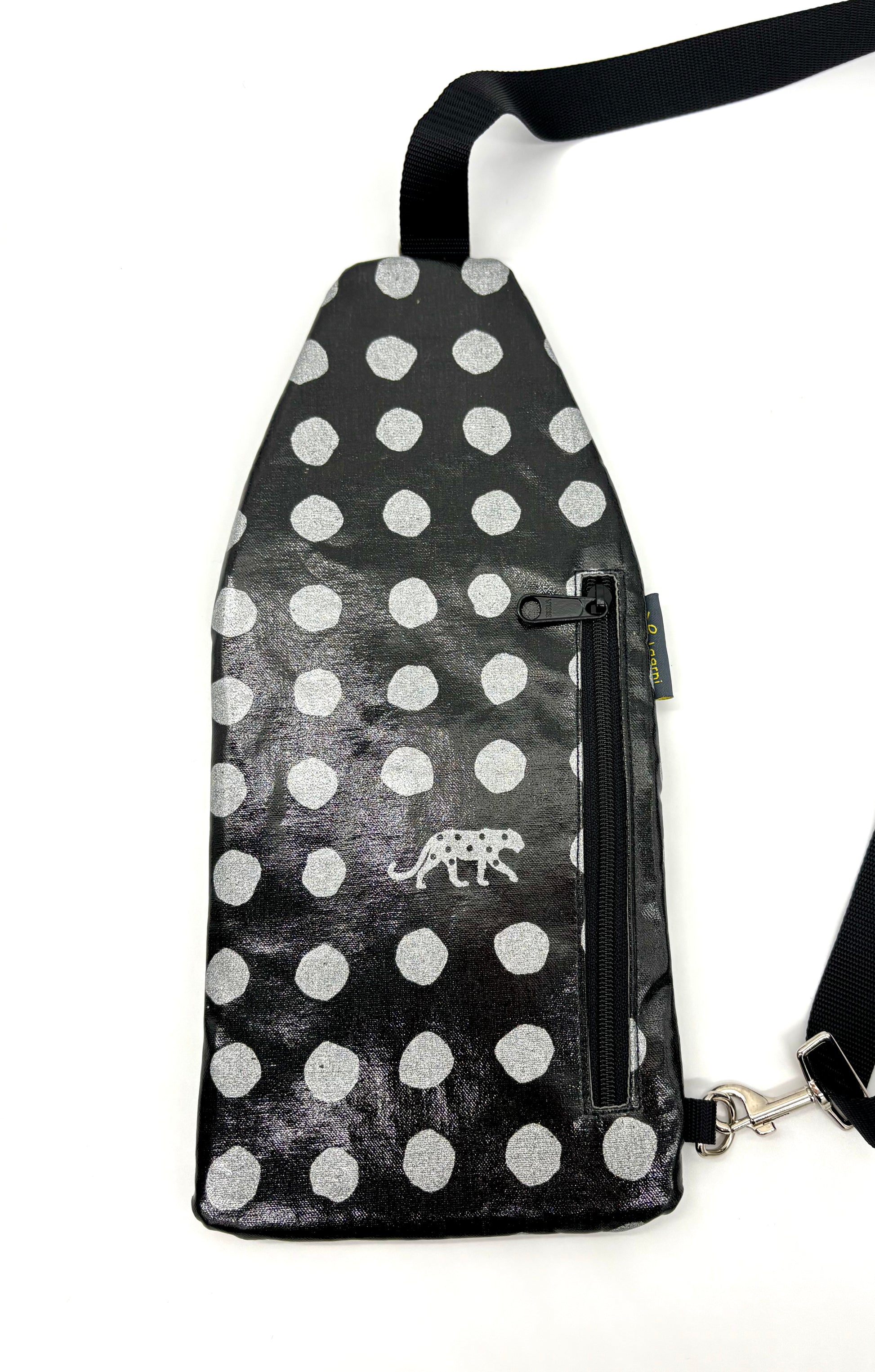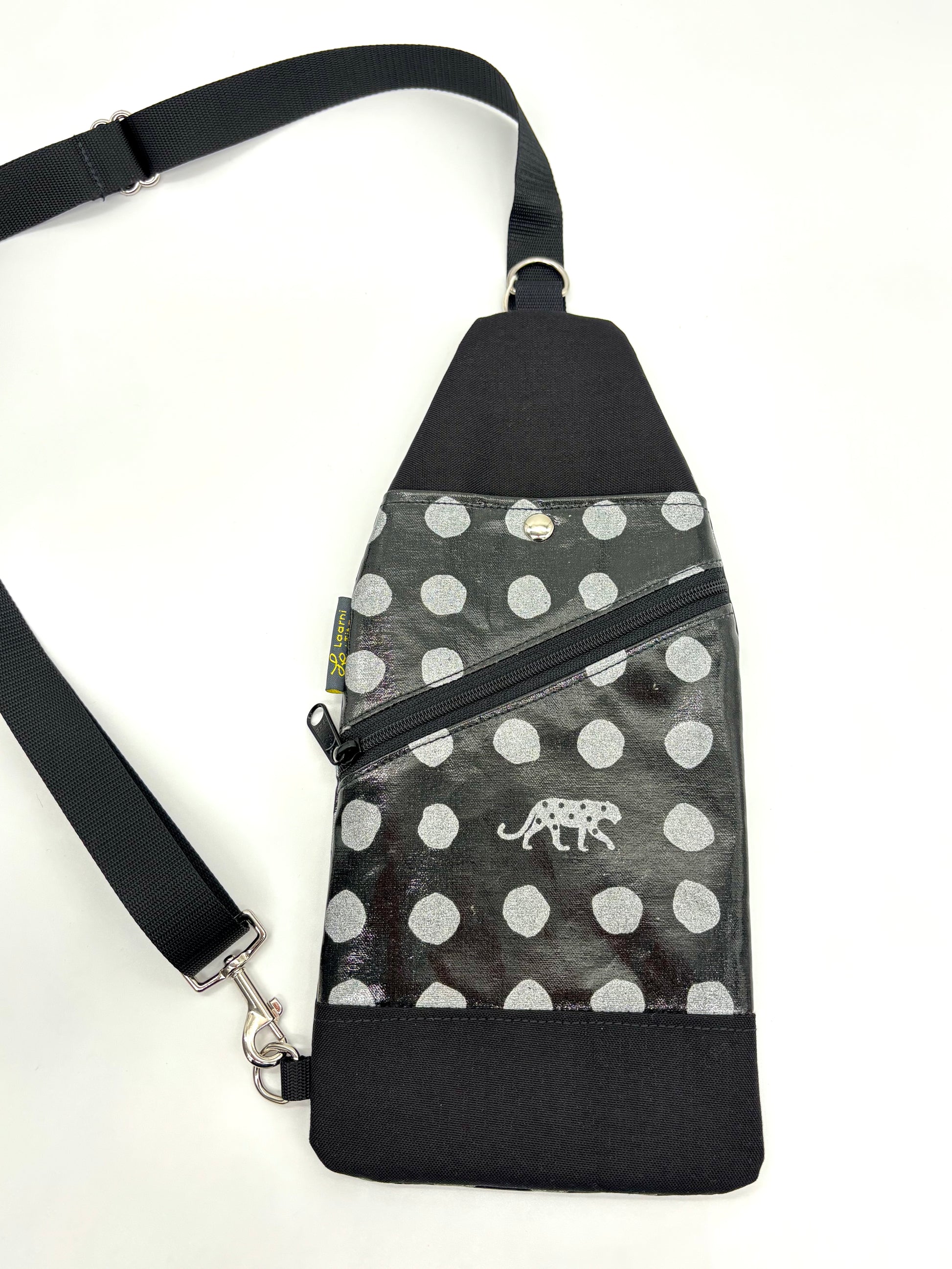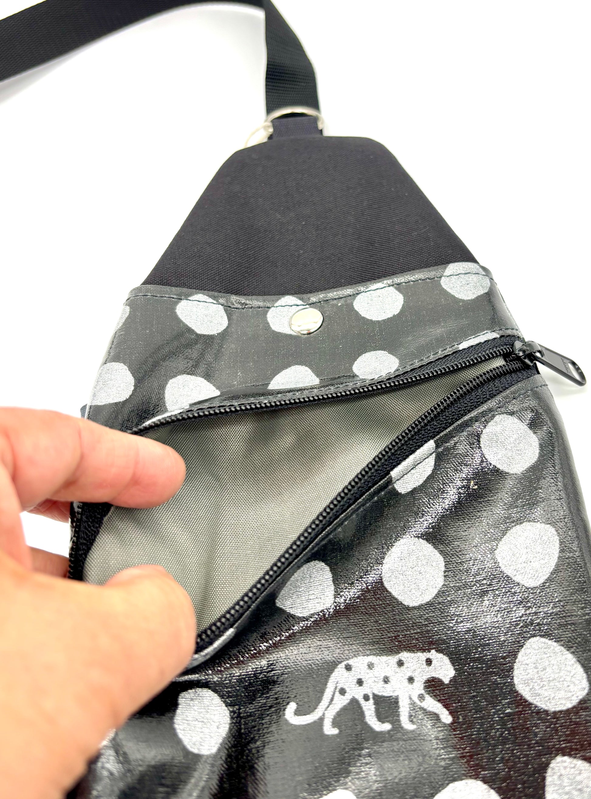 Outer fabric is laminated cotton canvas. Solid nylon accent fabric in black. Inside lining is nylon in silver.